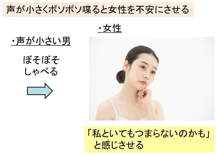 また、男性がボソボソと喋っていると、女性からすると単純に良く聞こえない場面が多くなります。するとコミュニティケーションが途切れ途切れになり、「なんかイライラする」「この人と話しててもあんま楽しくないのかも」と感じてしまうものです。