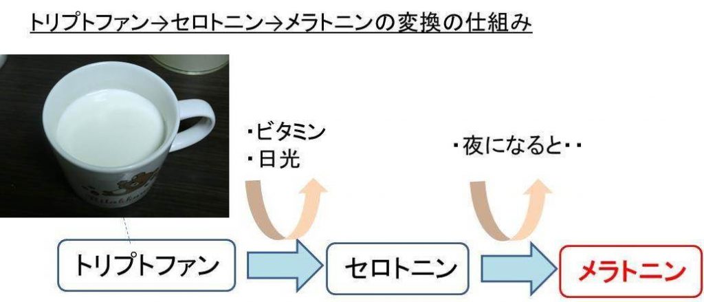 このトリプトファンと物質はビタミンBなどの作用によって、日中にセロトニンという物質に変換されます。このセロトニンが夜になると、メラトニンという物質に際変換され、この物質が睡眠の質を上げるのです。